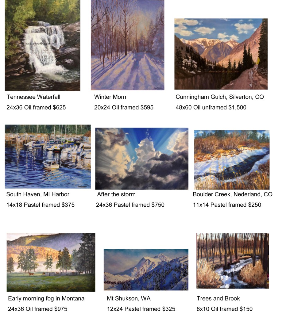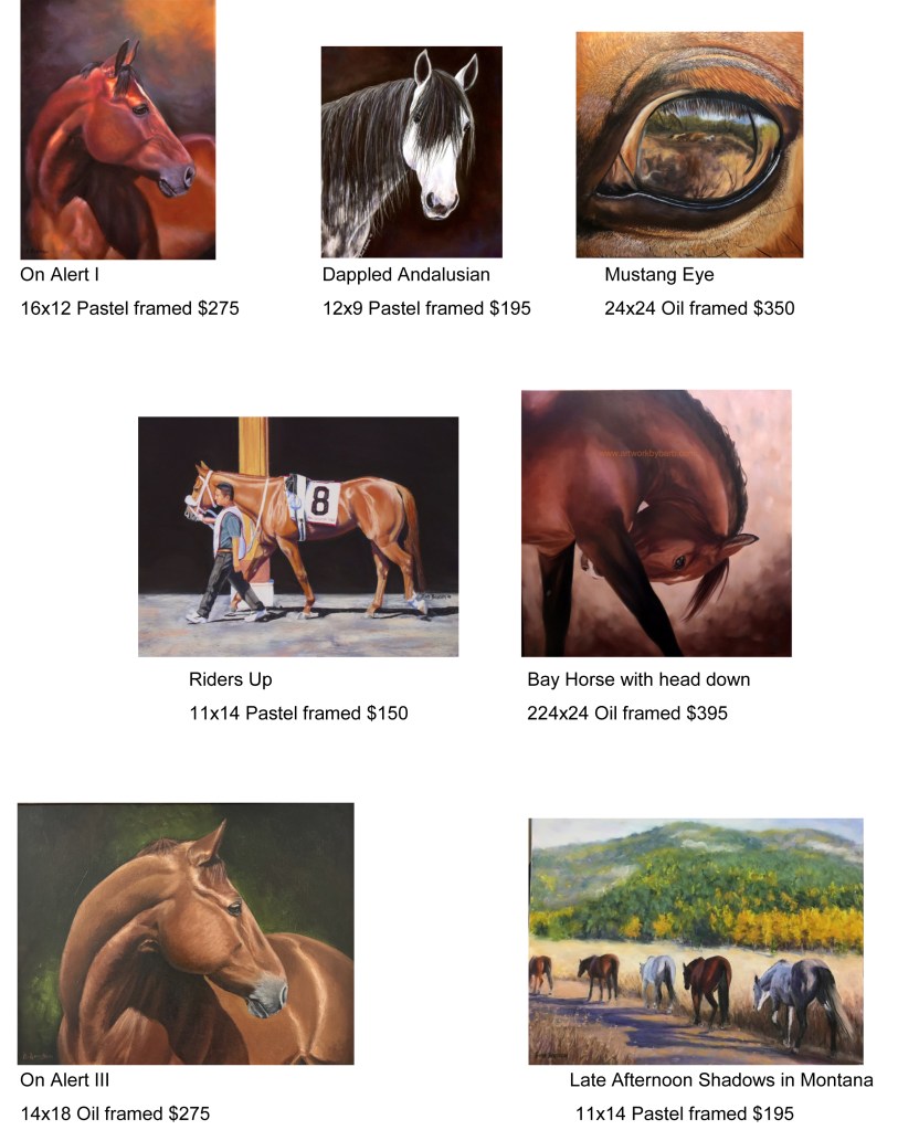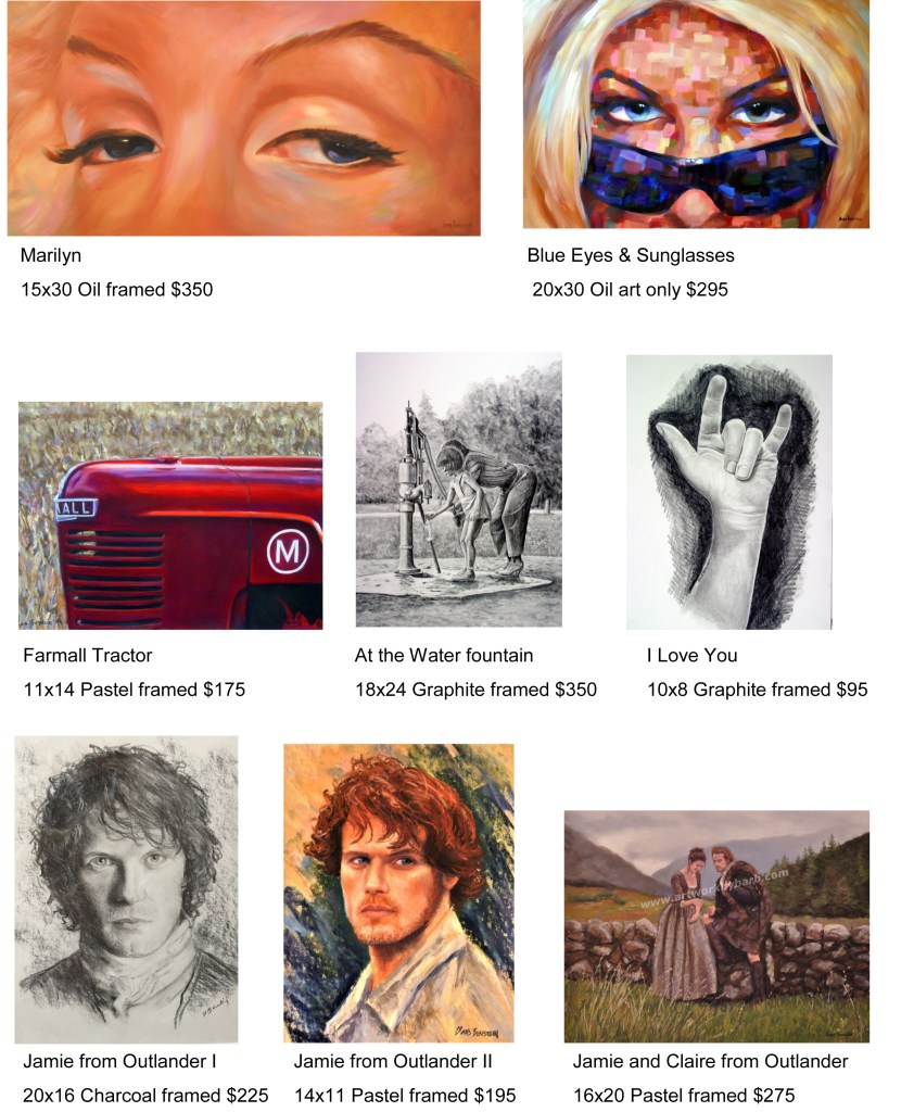 Original artwork for sale in either pastels, oils, or graphite. Most are framed and that is included in the price. Shipping costs, if applicable, are additional.